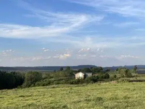 The house is on a small holding, surrounded by her brother’s pig farm. The family has farmed here since the early 1950s. A property line dispute resulted in Michelle’s farm be land locked. The make shift driveway is a mowed path through the pasture. I had my first good view of the wall that is waiting to be painted as we drove up just before sunset.