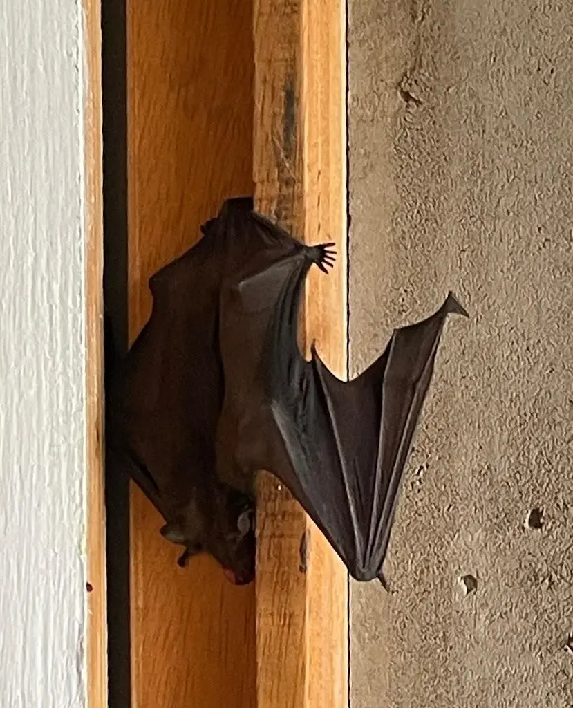 The bat must have landed on the door sill while I was in the toilet. When I first tried to close the door, it was trapped. Each time I opened and closed the door to try to get it to latch, the bat was squished just a bit more until I finally closed the door. It didn’t make a sound.