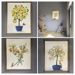 Instead of the required 5 hours/5 days each week, I started work around 8 and finished around 5 every day until I was sure I would complete the project. Painting on concrete presented some new challenges and learning opportunities. In the end, I was happy with the result and the owner appreciated the effort and the art. Each room is named for a citrus variety and that defined the painting. Then I added a mock frame to give the illusion of a hung painting. I added regional birds and a butterfly to balance the paintings. By the time I was done, I was more than a little done thinking about citrus.