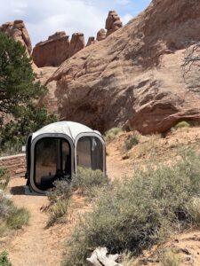 With camp sort of set up, I left to go back to the visitor’s center to get my pass for the Fiery Canyon guided hike the next day. Arches has a really nice visitor center, located right inside the park entrance. There was a big gift shop, big bathrooms and water bottle filling stations. With the summer rules for timed arrivals, the wasn’t much of a wait to get into the park. Because I was camping, I didn’t need an arrival pass, just my campsite reservation info and my Lifetime Senior Access pass.